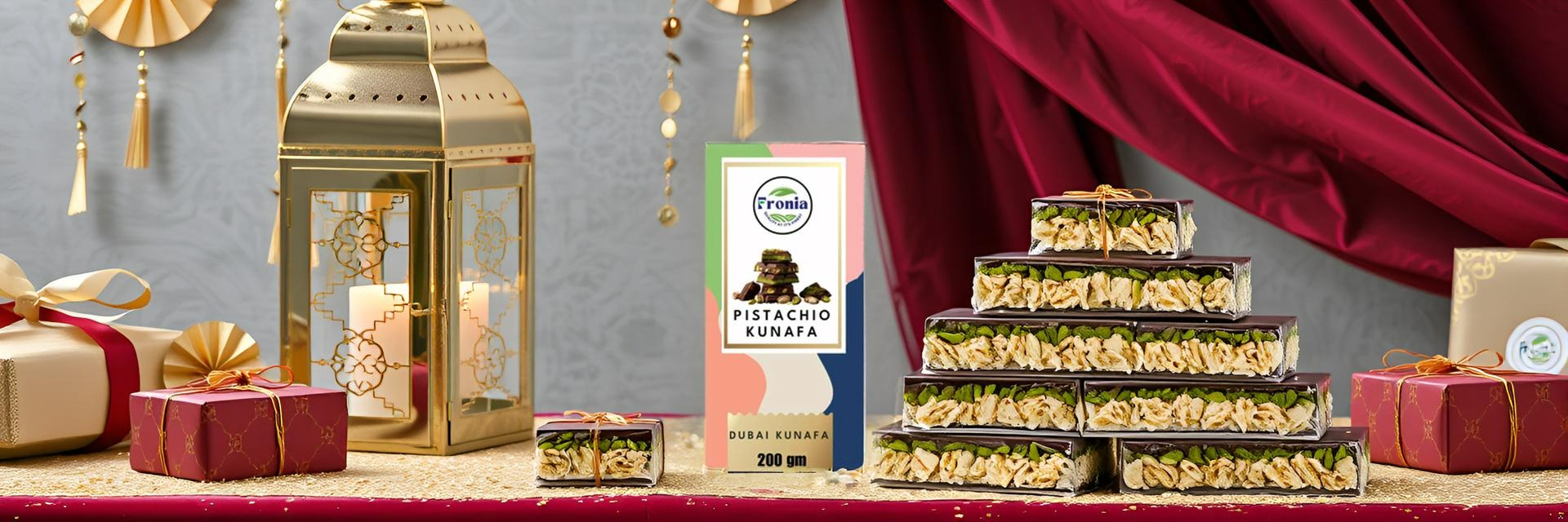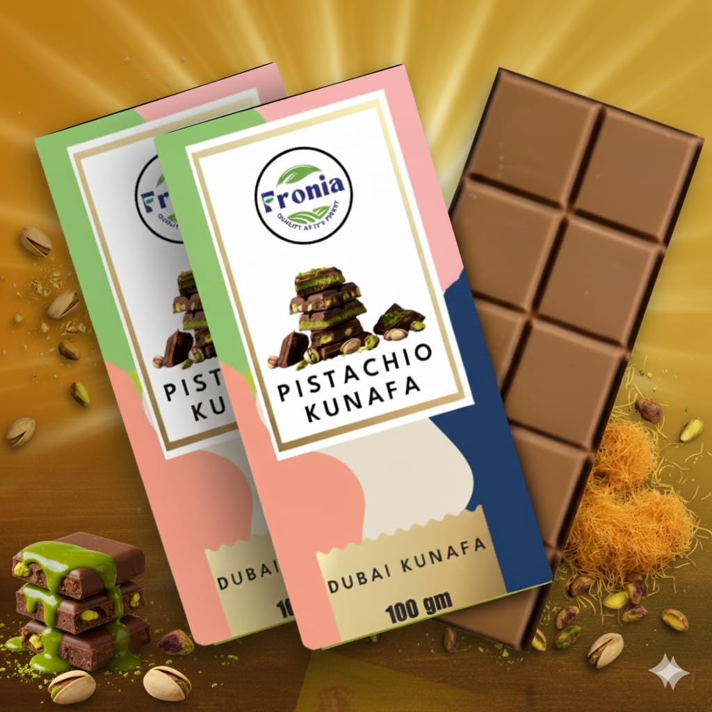 Fronia Dubai Kunafa Chocolate Pistachio. Premium Pista Kunafa Chocoalte 100gms. For Gifting, Anniversary, Birthday, Hamper, Valentines, Corporate Gifting.