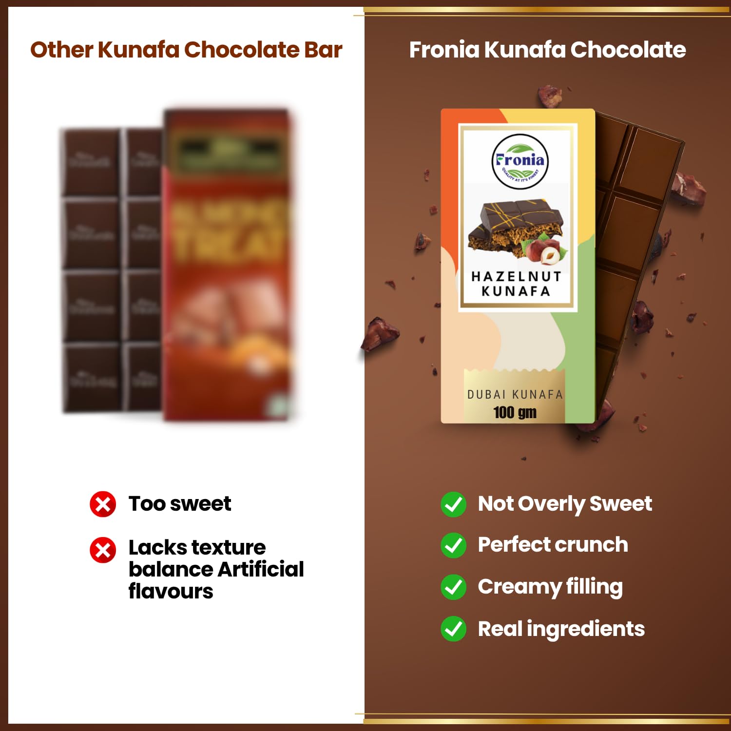 - 🕌 Inspired by Global Palates Dubai Kunafa Chocolate draws inspiration from European hazelnut desserts and Middle Eastern traditions—crafted for Indian sophistication.